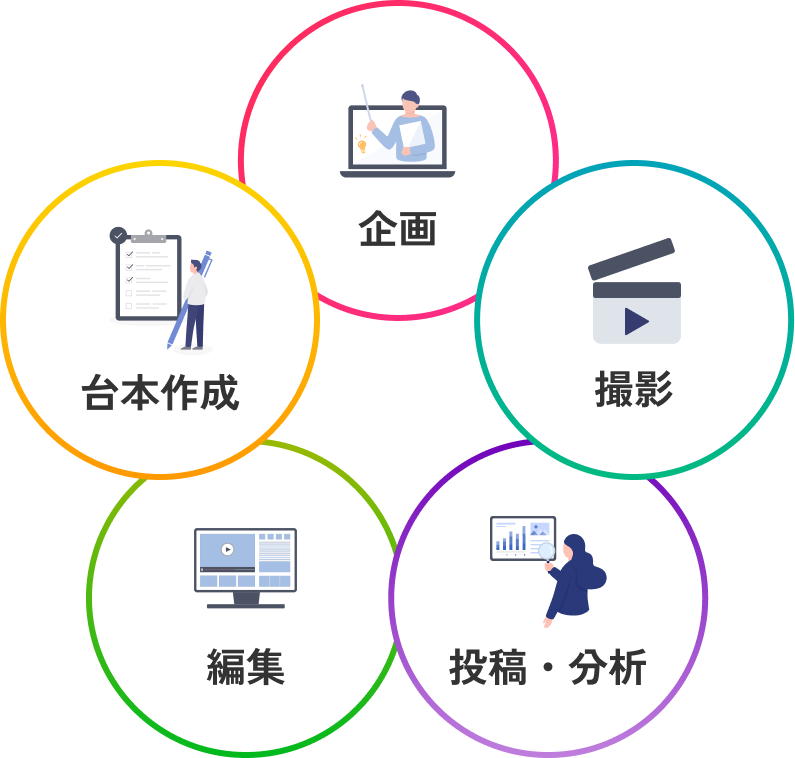 クリエイティブの制作(ショート動画の企画/台本作成/撮影/編集)からオウンドSNS(TikTok/Instagram/YouTube)の運用(投稿管理/分析改善)までワンストップでソリューションをご提供しております。